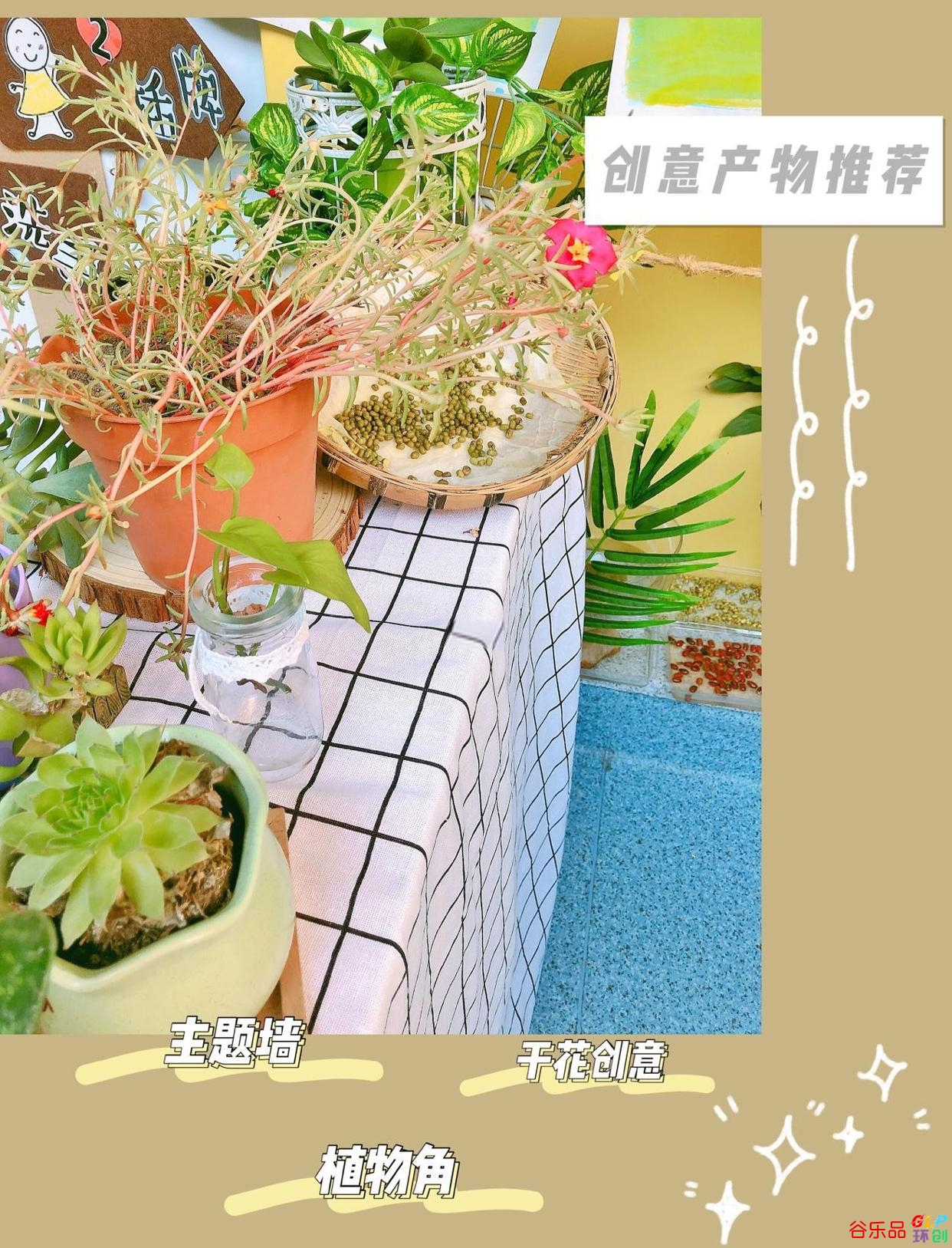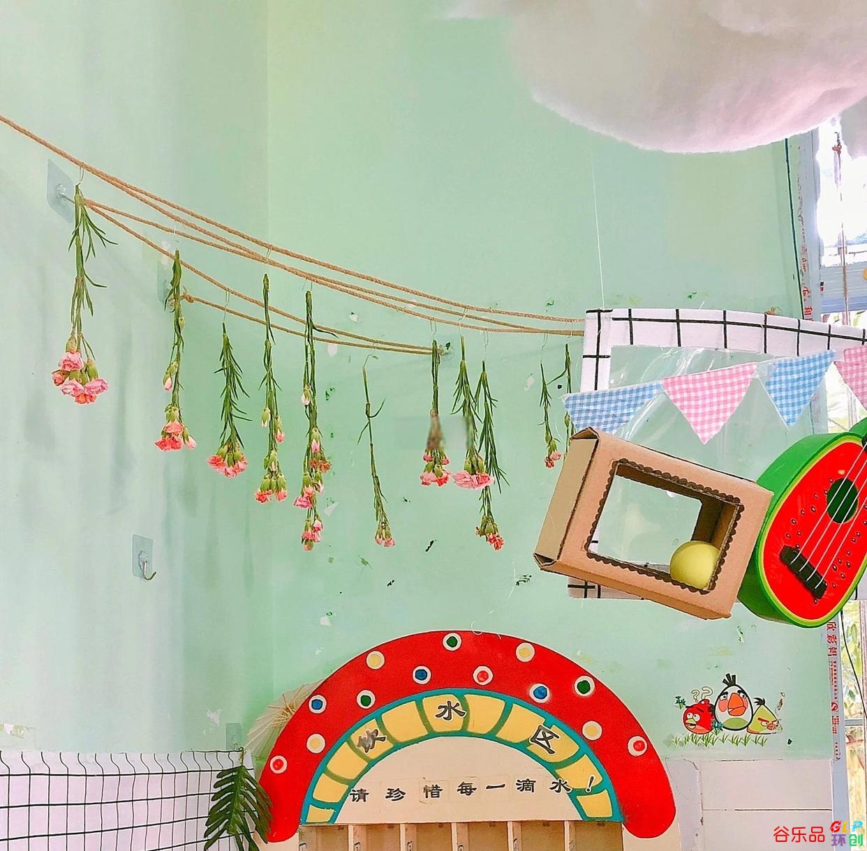 🌈角落墙:选择一个三角形角落墙,拉上线和小朋友一起制作风干花,非常有趣。