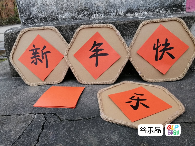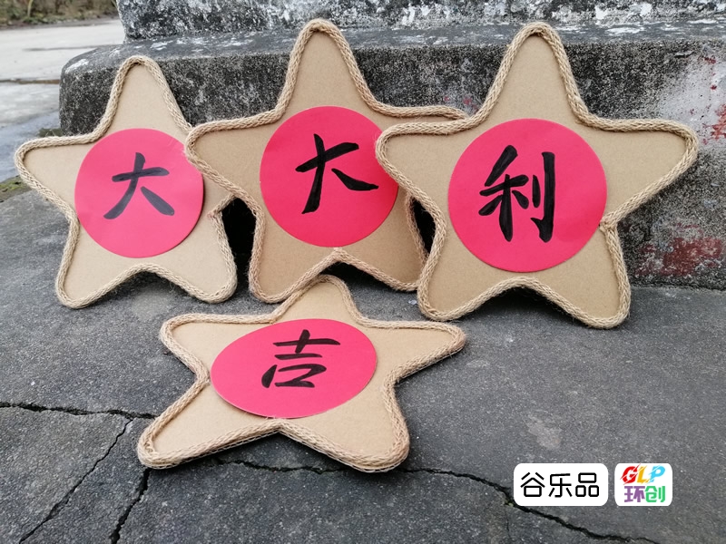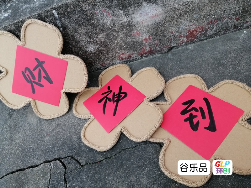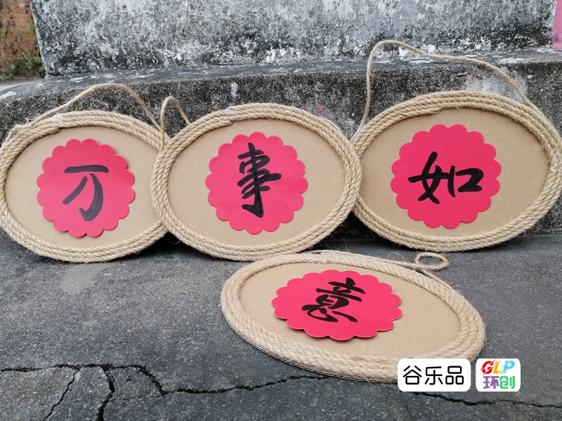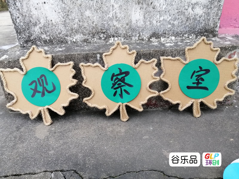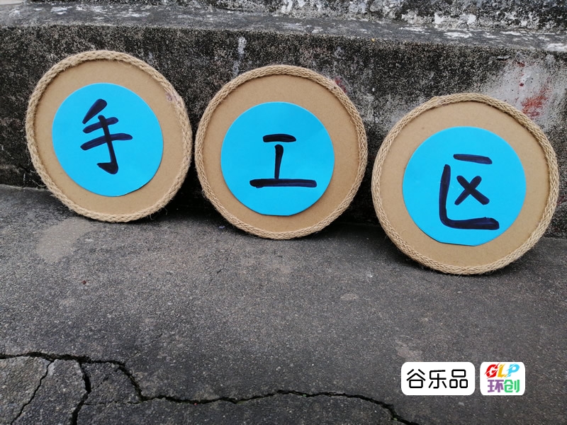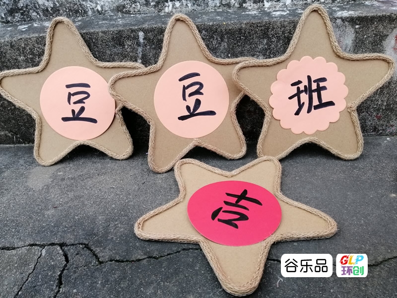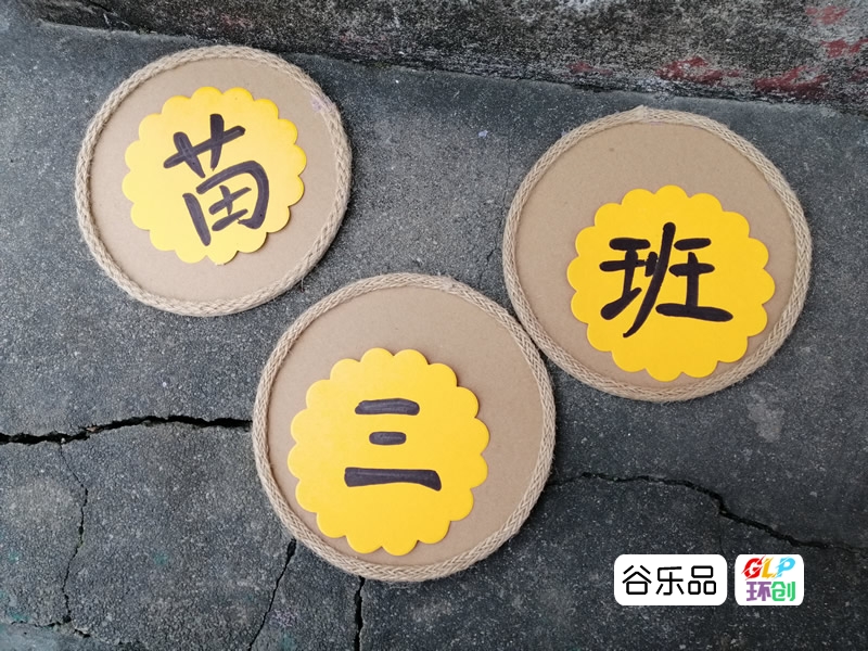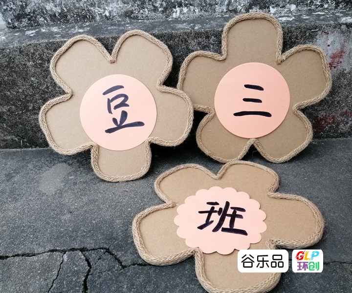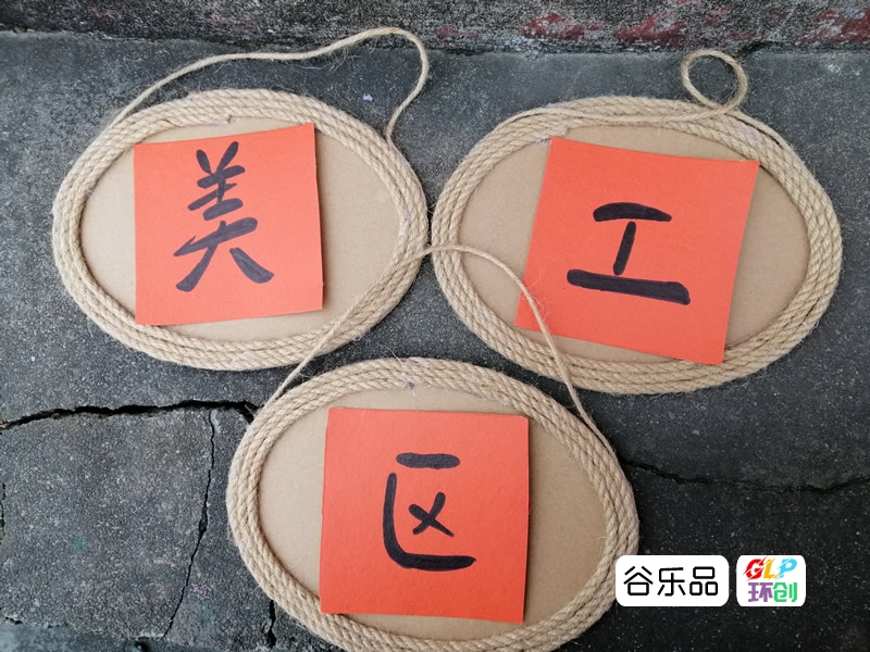 各种形状的纸板加麻绳边装饰配彩印卡纸做区角挂牌