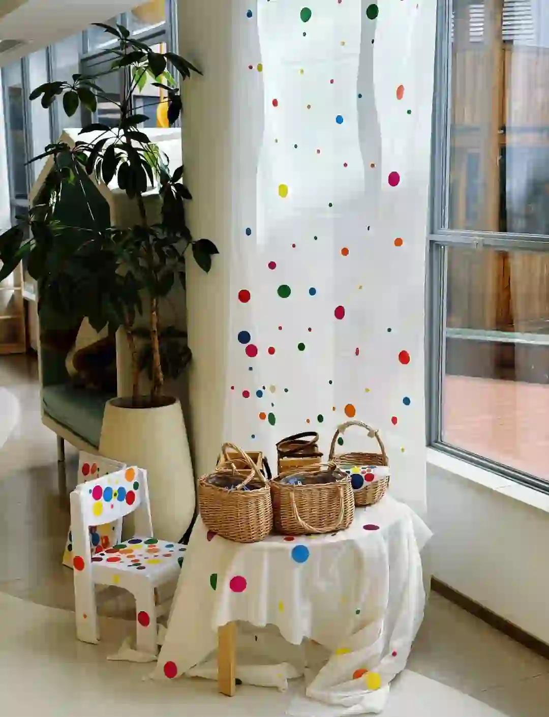 🎈 波点区:让孩子们用圆点贴纸自由创作,装饰桌布、椅子、小鱼和瓶子,打造出独特的波点风格。